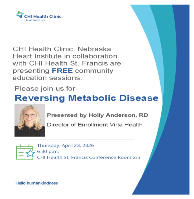 DESCRIPTION:CHI Health Clinic: Nebraska Heart Institute in collaboration with CHI Health St. Francis are presenting FREE community education sessions.\n\nPlease join us for\nReversing Metabolic Disease\n\nPresented by Holly Anderson\, RD\nDirector of Enrollment Virta Health
